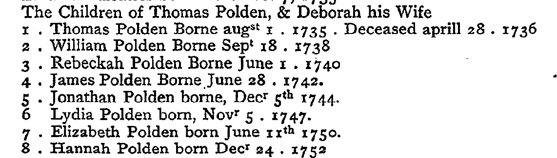 Thomas Polden, son of John and Lydia Pollard/Polden, married Deborah Spooner in Plymouth and they had several children including James Polden Sr born Jun 28, 1742 Oddly enough, this Church record has Polland, Poland and Polden as the surnames for one family.