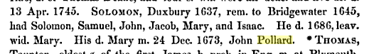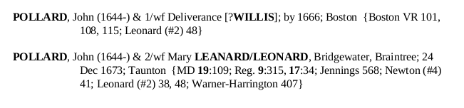 John Pollard b. 1644 married twice. First to Deliverance Willis and they had three children. Second to Mary Leonard of Taunton who’s family had moved there from Duxbury. They had three more children including another John Pollard born Mar 20, 1675