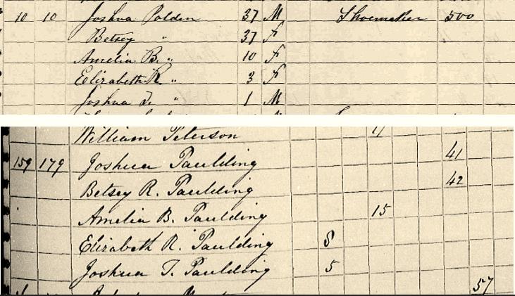 My Great Great Grandfather Joshua Thomas Polden Sr married Betsey Atwell in 1839 and they only had a son born Jun 26, 1850 as Joshua Thomas Polden Jr and shows as such in the 1850 census but for the 1855 census Joshua Sr, wife Betsey and Joshua Jr, now 5 years old, are listed as Paulding, as are the rest of the children. I see there’s a note on his tree page stating;